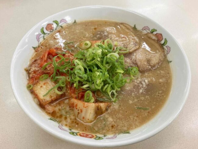 醤油ベースの豚骨系スープにドサっと真っ赤なキムチが乗った、いかにも「スタミナ系」の見た目。