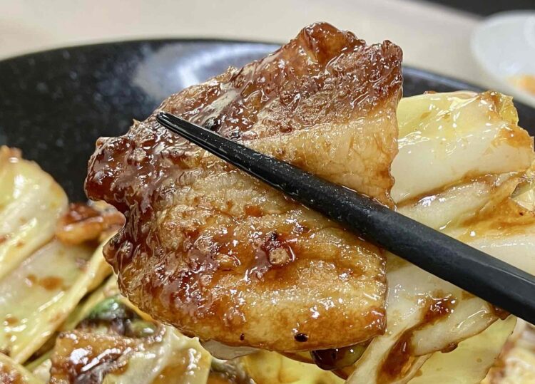 普通の回鍋肉は小間切れ肉なのに対して、極王回鍋肉はシッカリした豚バラ肉。