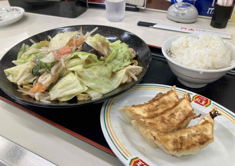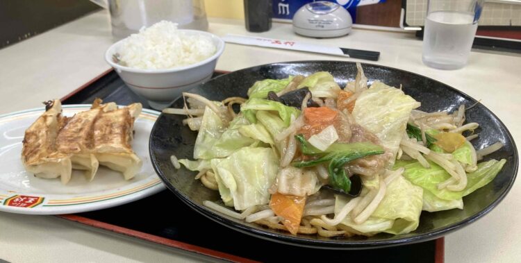 4月の期間限定の麺メニュー「春のあんかけ焼きそば」に、ライス(小)とジャストサイズの餃子(通常サイズの餃子が3つ)がついてきます。