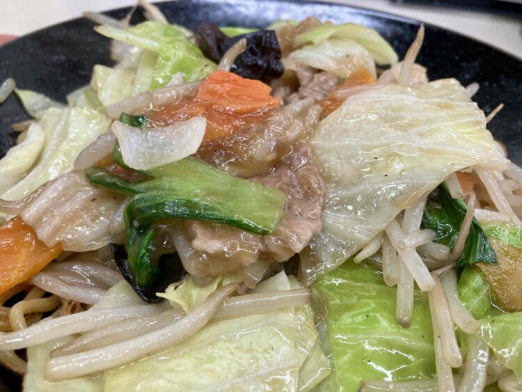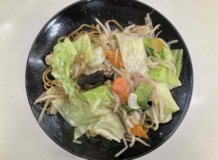 生姜の風味がアクセントになった餡で和えた野菜炒めをボリューム満点の焼きそばにタップリかけた逸品。