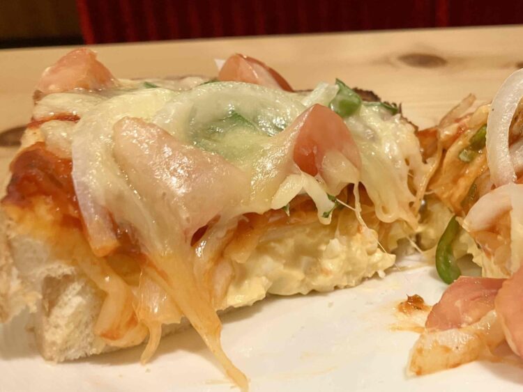 コメダ珈琲店「たっぷりたまごピザトースト」横から全体写真