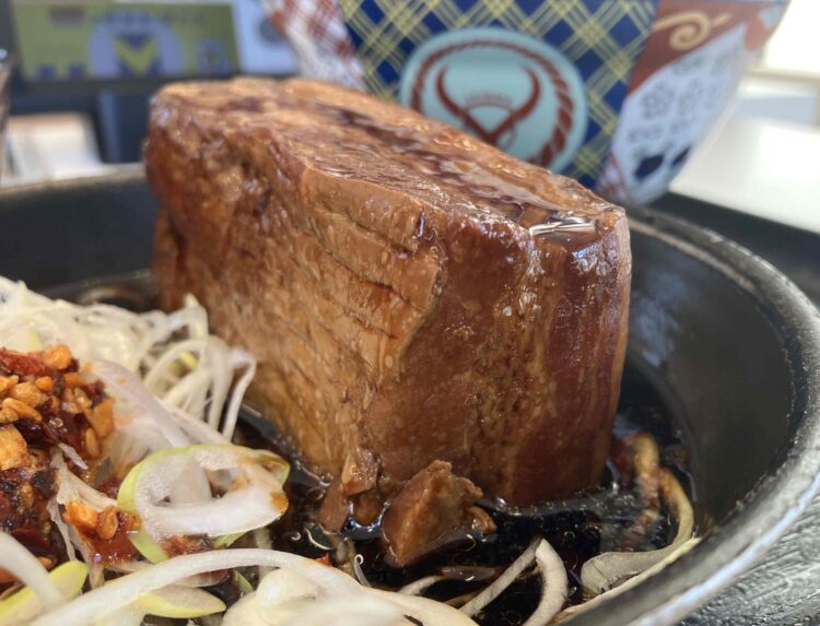 角煮の横についているネギと「食べるラー油」と一緒に食べると最高においしい!